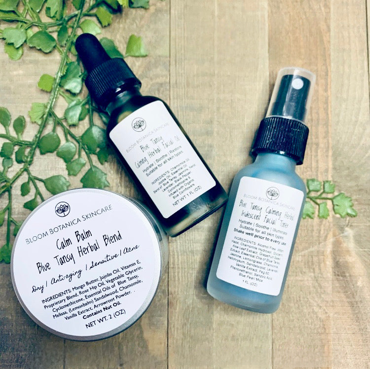 1(OZ) Calming Herbal Facial Oil as well as the 2(OZ) Calm Balm. This Blue Tansy Herbal Blend is a great moisturizing bundle to soothe the skin