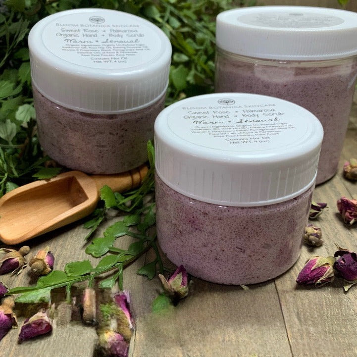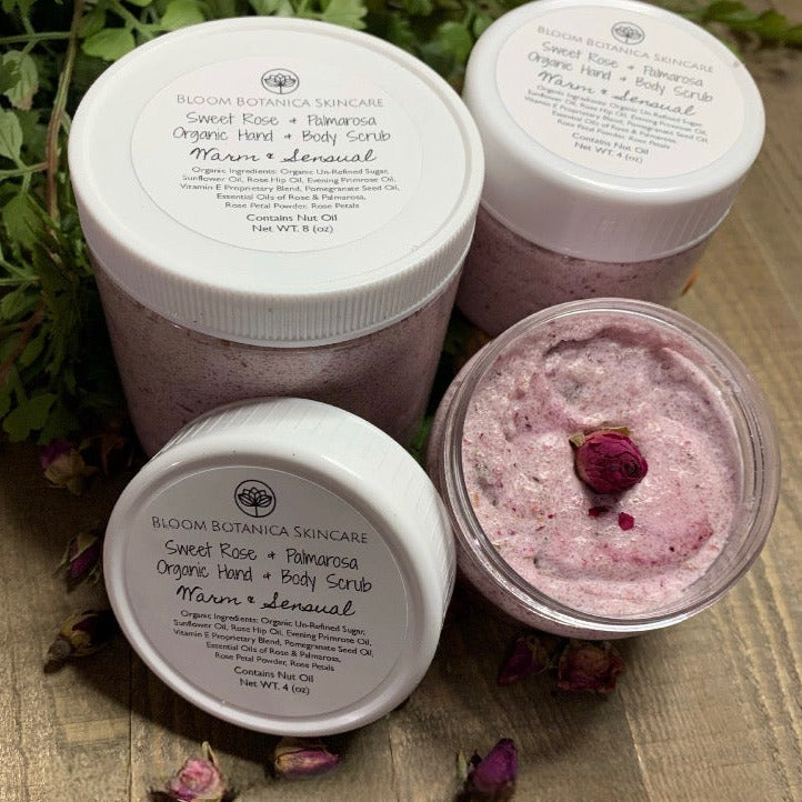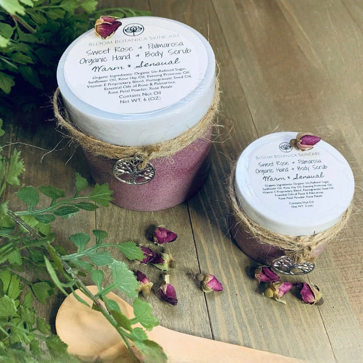 Organic Sweet Rose & Palmarosa Body Sugar Scrub smells heavenly, and will leave your skin silky smooth, nourished, and hydrated for hours. This is naturally scented and colored with Organic rose petal powder & organic essential oils. After using any of our sugar scrubs you will feel so moisturized you won't need to apply lotion. It's THAT good!