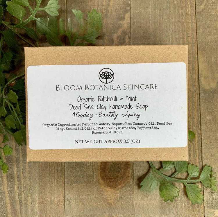 Patchouli & Mint Dead Sea Clay Organic Hand-poured Soap will have your skin feeling, clean, soft, & completely refreshed. The smell is so unique. The upper notes of mint are very refreshing with the earthy undertones of the patchouli, rosemary, cinnamon & clove. This would be a great scent for anyone. Each handmade bar is approximately 3.5-4 ounces.All our soaps come with a free Ramie soap saver drawstring bag. These bags give you excellent exfoliation and so much lather. They also allow you to use the soap down to the last sliver. Eco-friendly and no waste.