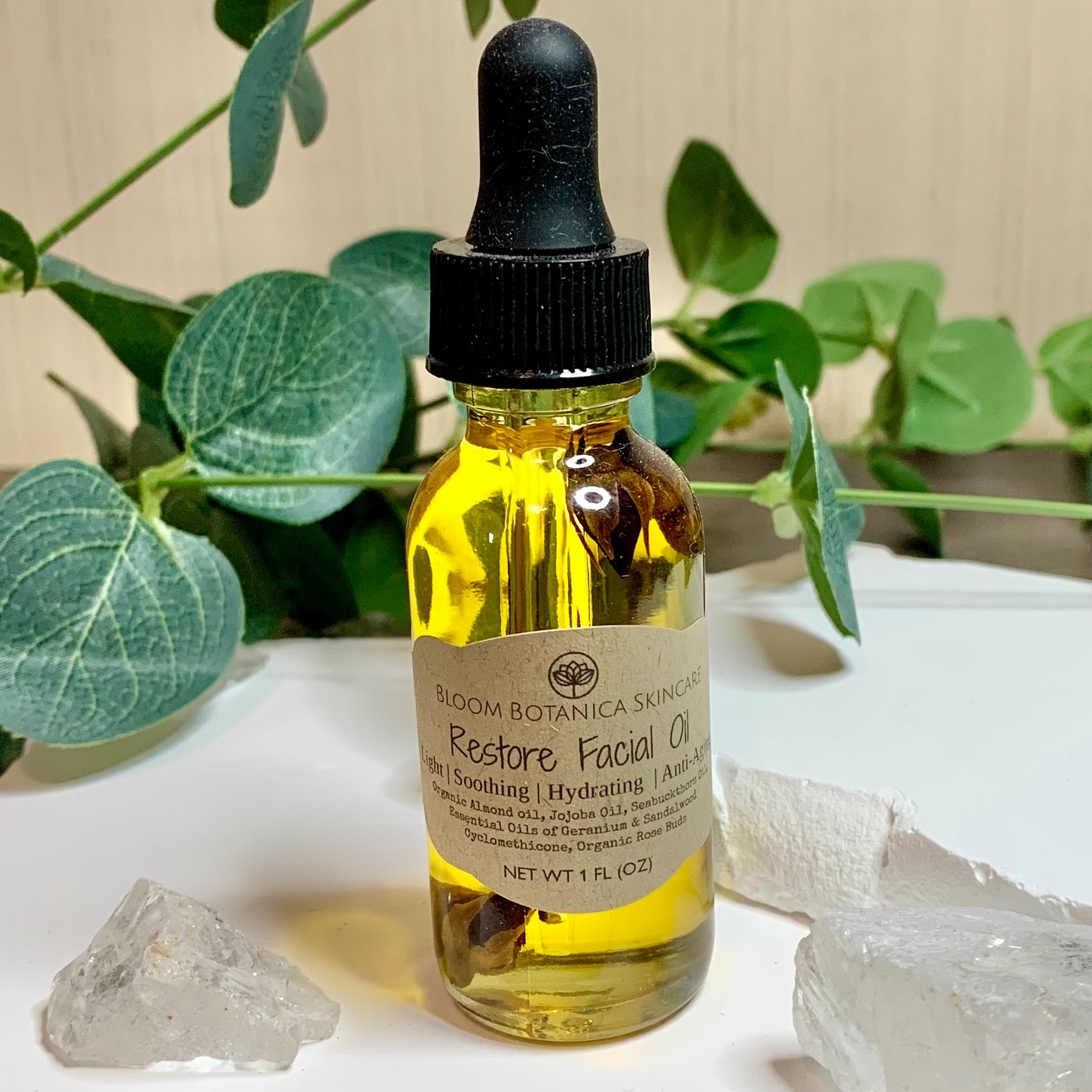 Restore Facial Oil is a soothing, light, rebalancing, and anti-aging skincare product that is great for normal, dry skin, sensitive, mature & dehydrated skin. This is hands down one of our FAVORITE facial moisturizing oils and a TOP SELLER at Bloom Healing Spa. The smell is so magical and lovely. It is loved by both men & women. The sandalwood gives it that earthy & warm undertone.