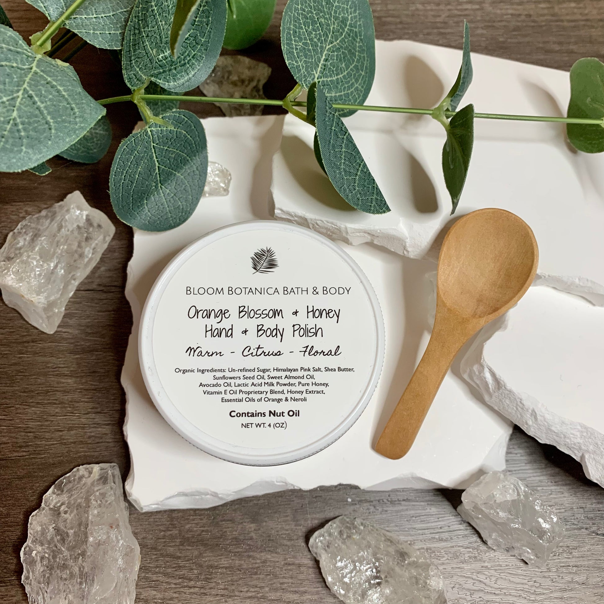 Un-refined sugar, Himalayan Pink Salt, Shea Butter, Sunflower Seed Oil, Sweet Almond Oil, Avocado Oil, Lactic Acid Milk Powder, Pure Honey, Vitamin E Oil Blend, Honey Extract, Essential Oils of Orange & Neroli.