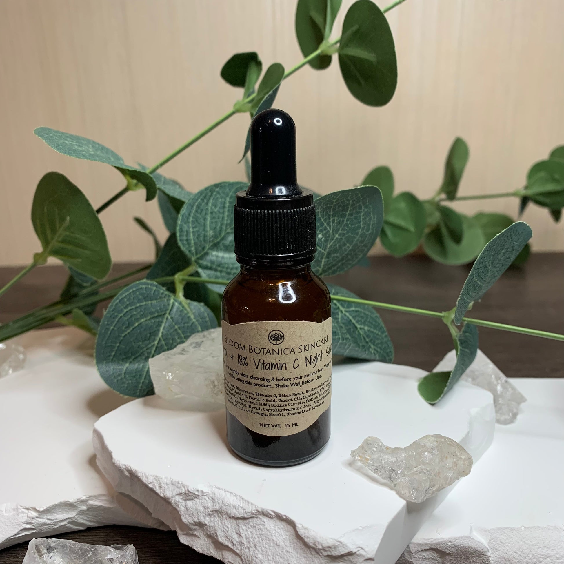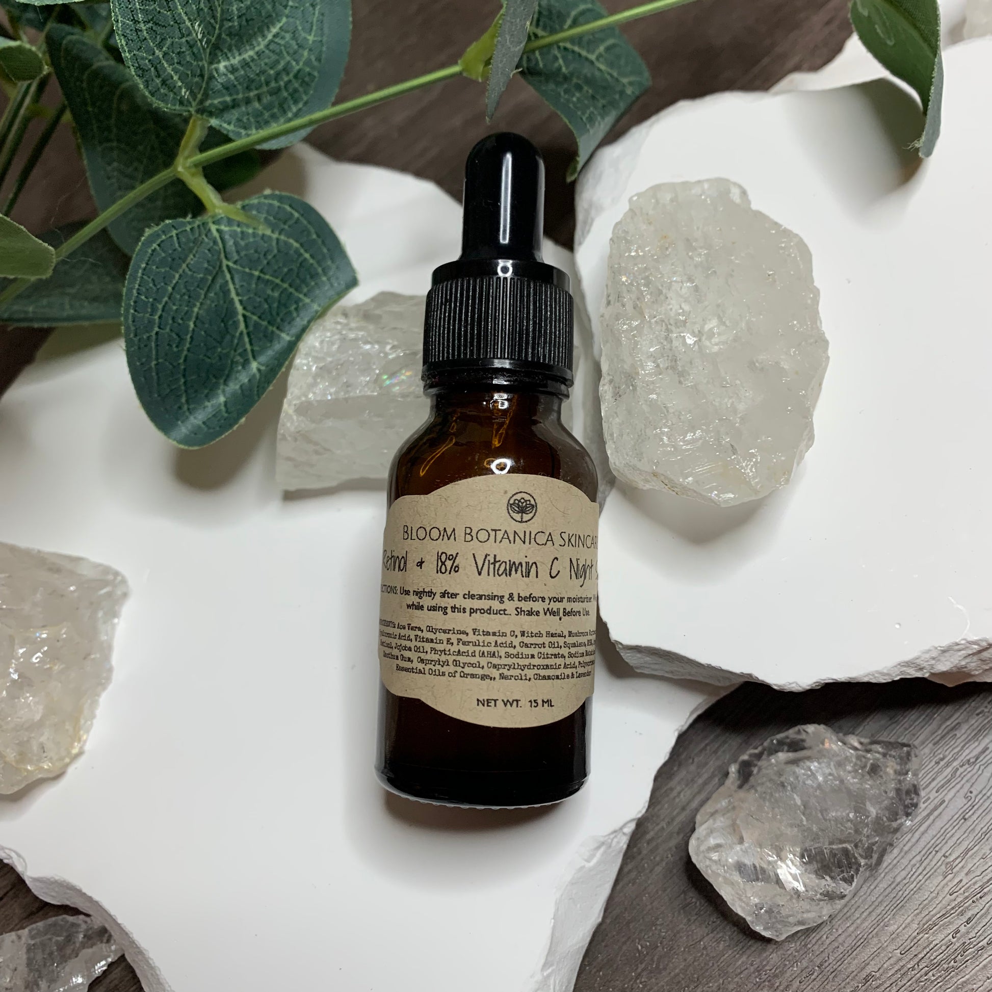 Retinol & 18% Vitamin C Night Serum is a powerful anti-aging skin treatment. Retinol is one of the most researched and affective anti-aging ingredients on the market today. It helps to improve the texture of the skin & visibly reduce wrinkles over time. It is known to give you a brighter more luminous, glowing skin tone. T